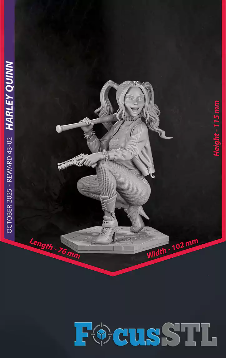 - Multi-Part Harley Quinn Statue: High-detail split files for clean printing and easy assembly (head, jacket, legs, arms, boots, base, accessories).
